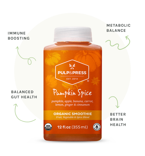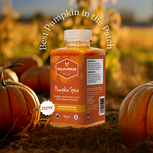BACK FOR A LIMITED TIME, your perfect cozy companion for fall, this Pumpkin Spice Smoothie is our healthy take on the infamous PSL. Crafted from 100% organic ingredients, it has the natural goodness of REAL pumpkin — no concentrates or added sugars here. With ingredients like banana, apple, and carrot, plus a kick of cinnamon and ginger, this seasonal smoothie is packed with pre-biotics, fibre, and vitamins.